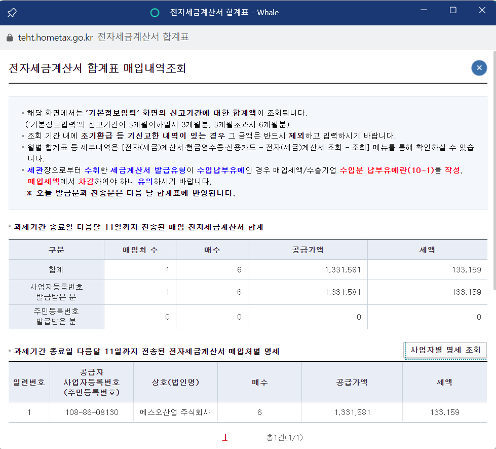 보통 평소에 관리비를 내고 관리실에서 몇일내로 전자세금계산서를 꾸준히 발행해 왔다면 "전자세금계산서 자료조회"를 클릭하면 제 사업자로 매입된 관리비 전자세금계산서 합계가 계산되고 그 10%인 금액이 부가가치세 환급이 될 것임을 확인할 수 있습니다. (매달 귀찮더라도 전자세금계산서를 꼬박 꼬박 확인했더니 여기 이 시점이 편하내요 ^^;)