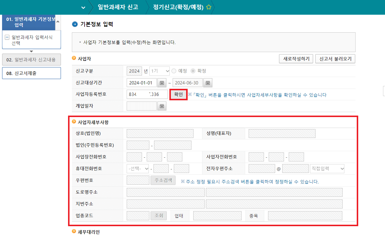 사업자등록번호를 보고 확인을 클릭하면 비어있던 사업자세부사항이 쫘라락~ 뜹니다.