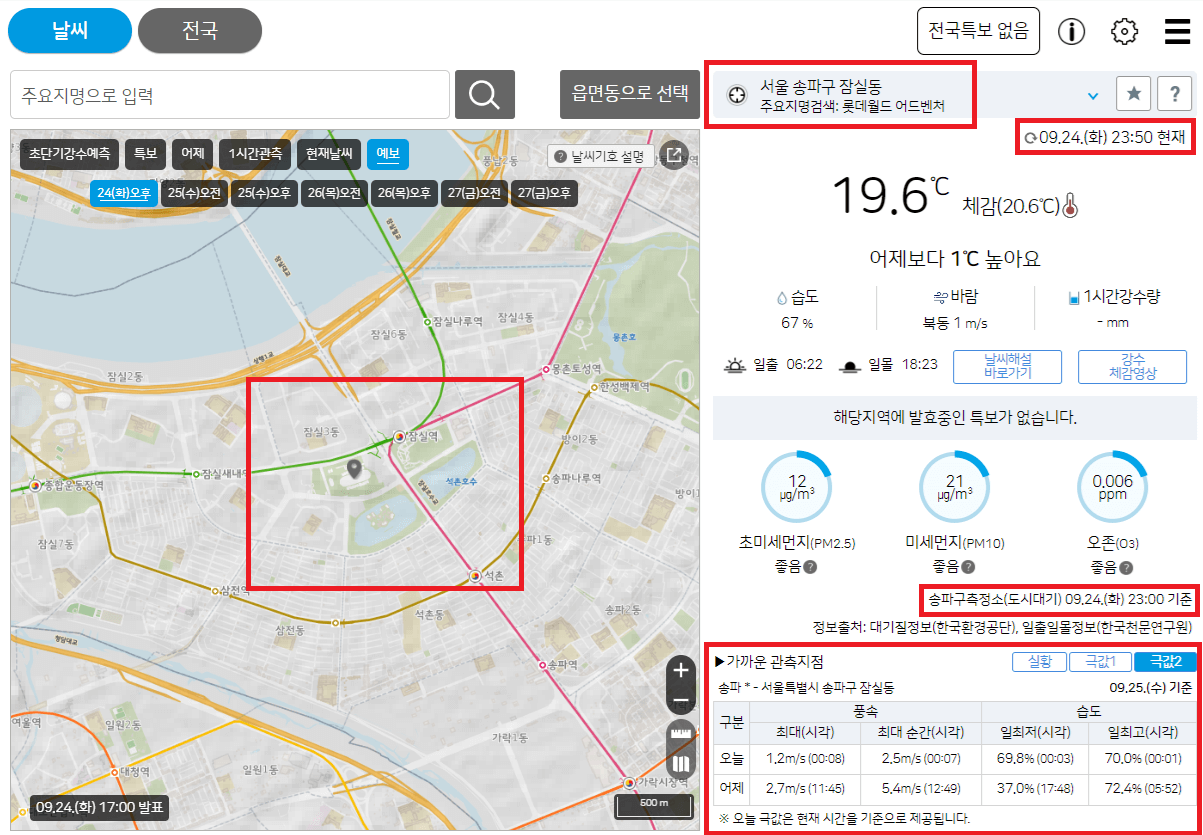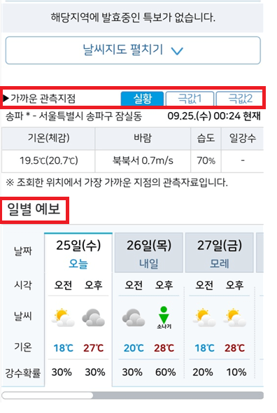 롯데월드 어드밴처 가까운 관측지점을 기준으로 실황, 극값1, 극값2 을 통해 기온(체감), 바람, 습도, 일강수를 더 자세히 안내해 줍니다.