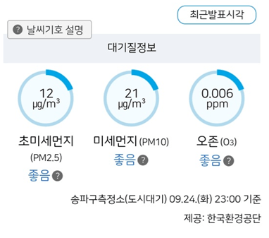 송파구측정소 기준으로 실시간 체감온도와 습도, 바람, 강수량, 초미세먼지, 오존 상태를 볼 수 있습니다.