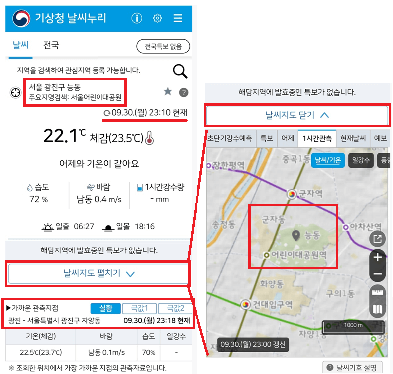 광진구측정소  기준으로 실시간 체감온도와 습도, 바람, 강수량, 초미세먼지, 오존 상태를 볼 수 있습니다.