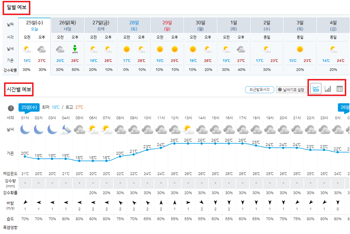 일별예보: 주간(7일) 오전 오후 날씨. 기온. 강수