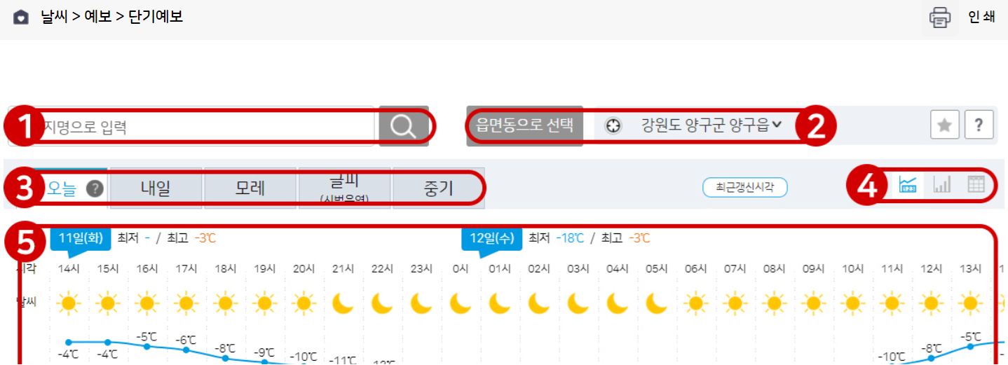 1. 조회하고자 하는 지명을 입력하면, 입력한 키워드를 기반으로 관련 지역의 구체적 단기예보를 조회 할 수 있습니다.