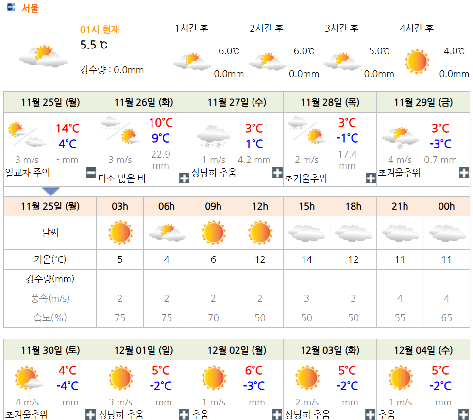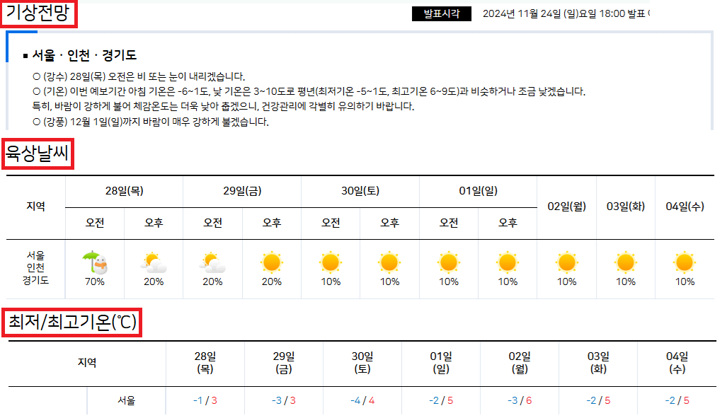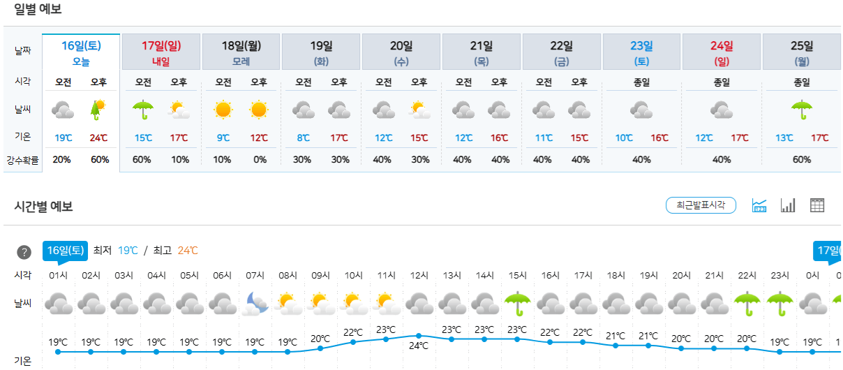 1. 기상청 날씨누리 단기예보를 통해 조회하는 날로부터 10일간의 일별예보와 시간별 예보 날씨를 확인할 수 있어요.