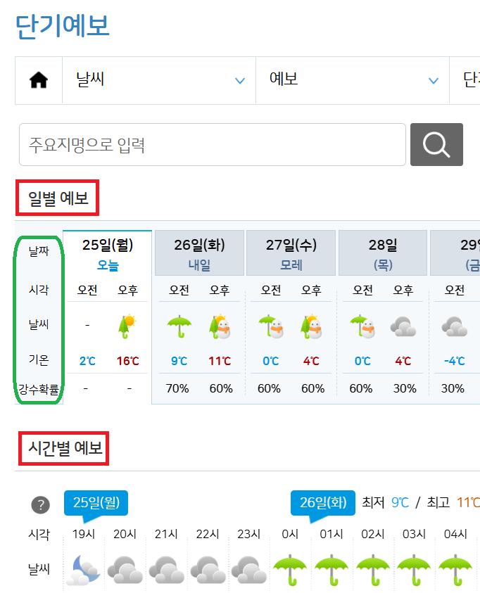 기상청 날씨누리 단기예보를 통해 조회하는 날로부터 3일간의 일별예보와 시간별 예보 날씨를 확인할 수 있어요. 11시와 17시에 발표합니다.