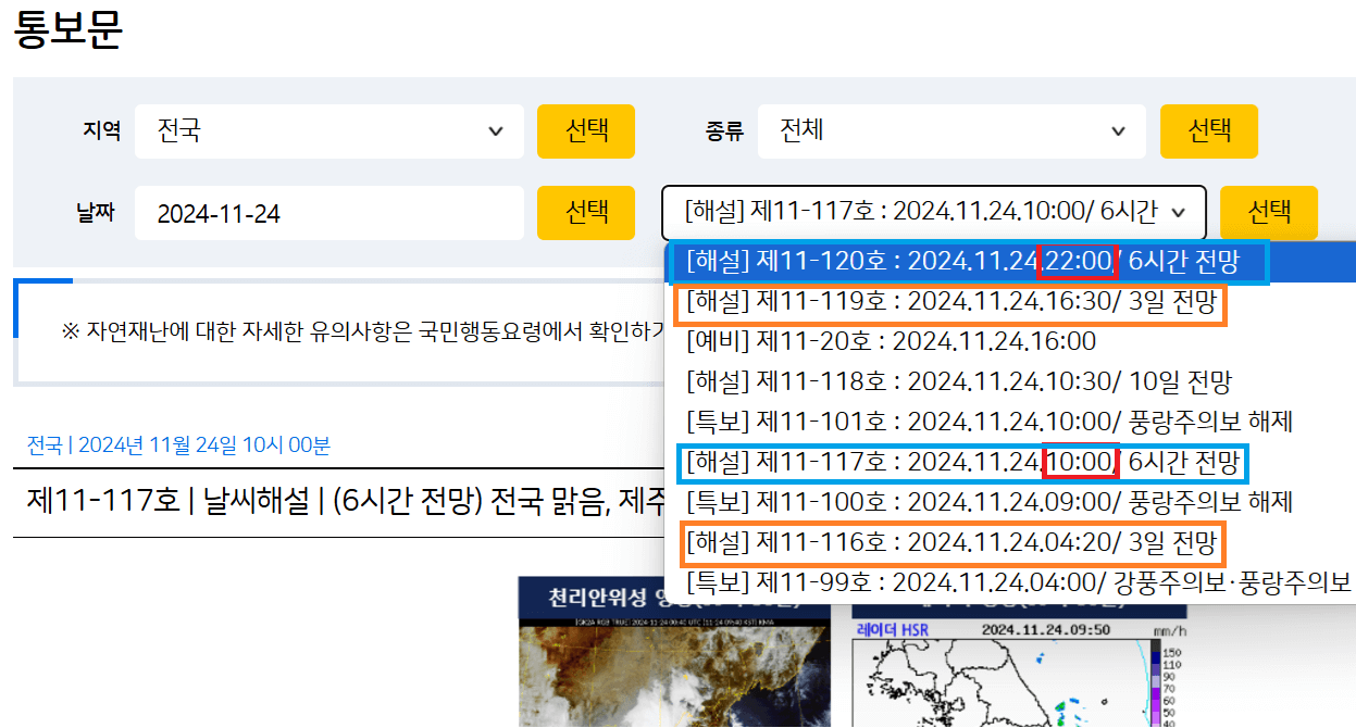기상청 날씨누리 초단기 예보는 통보문에서 매일 오전 10시, 오후 22시에 6시간 전망 날씨해설을 발표합니다.
