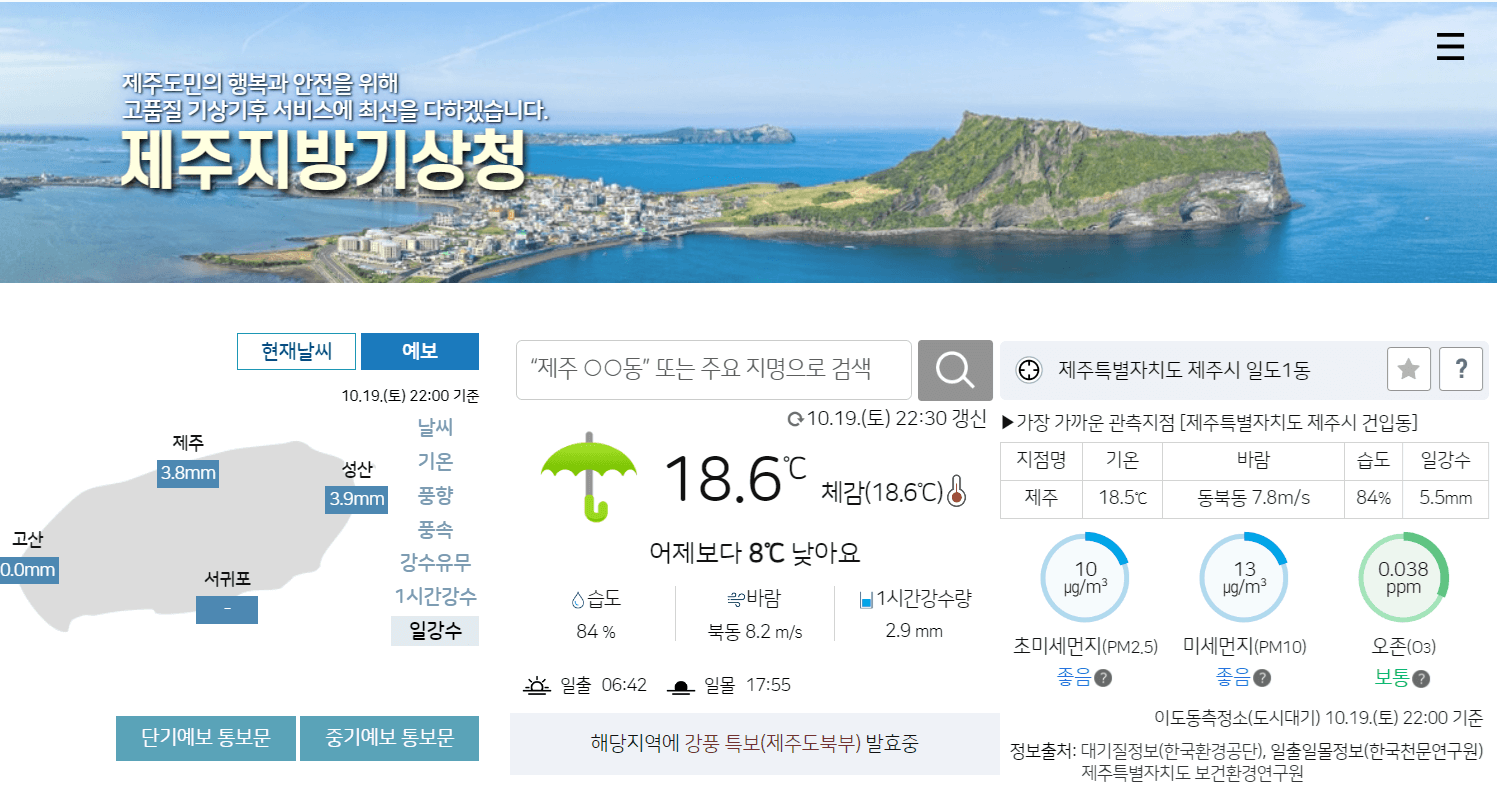 제주도의 산과 오름, 올레길, 둘레길의 날씨를 알 수 있습니다. 해당지역 기준으로 오늘, 내일, 모레의 시간별 날씨 기호와 기온, 체감온도, 강수량, 강수확률, 바람, 습도를 볼 수 있습니다. 한라산 국립공원 바로가기를 통해 입산 및 통제정보와 한라산 실시간 CCTV를 확인할 수 있습니다.