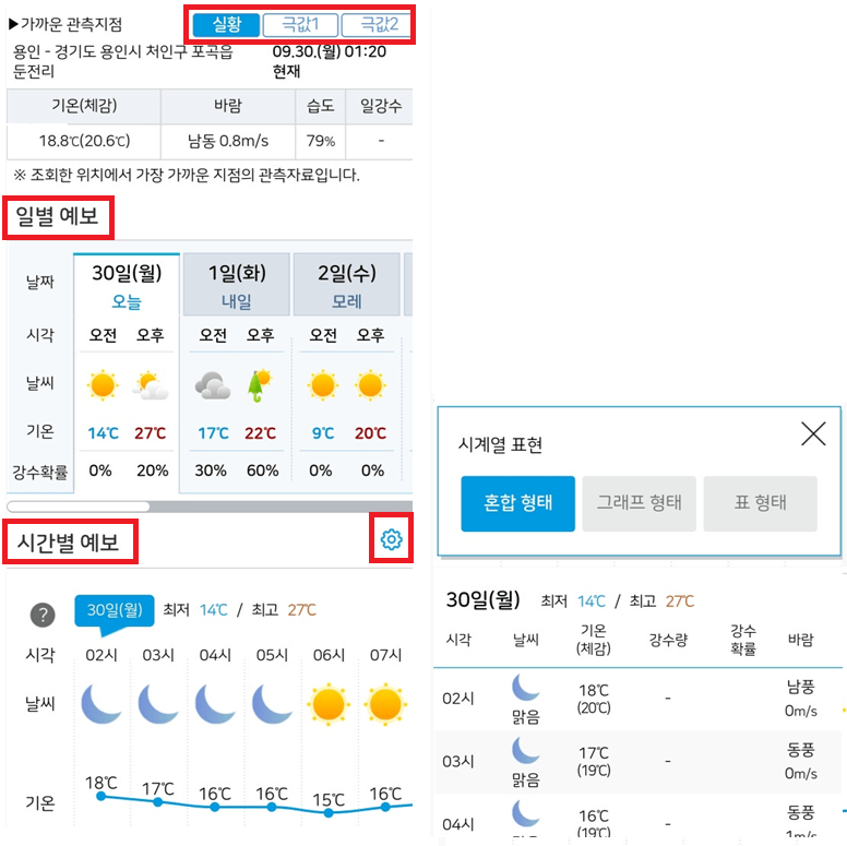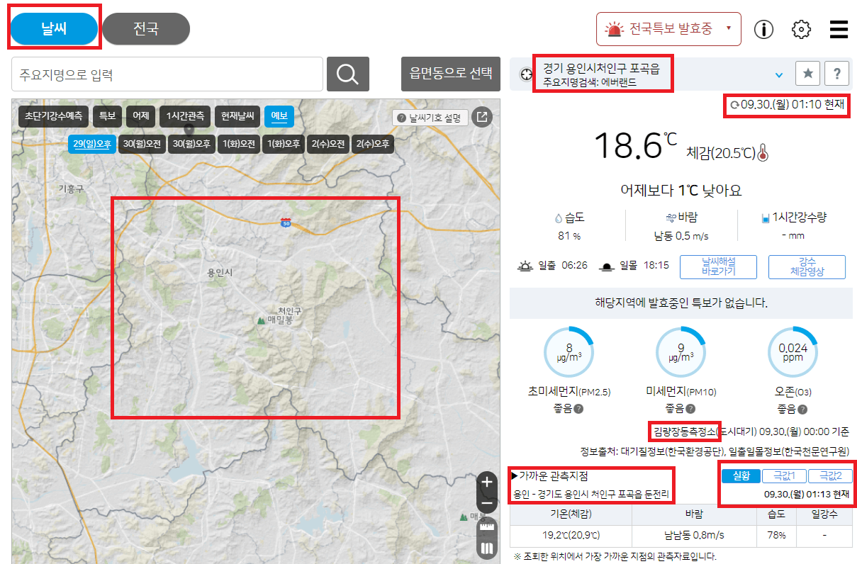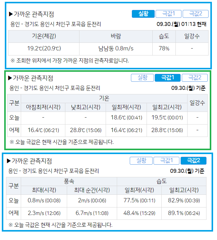 용인 에버랜드 가까운 관측지점을 기준으로 실황, 극값1, 극값2 을 통해 기온(체감), 바람, 습도, 일강수를 자세히 안내해 줍니다.