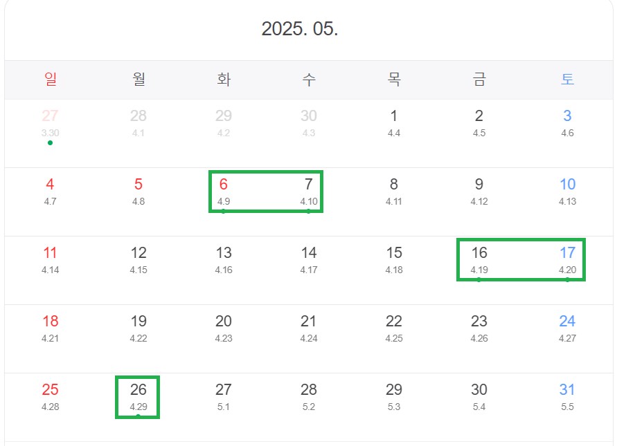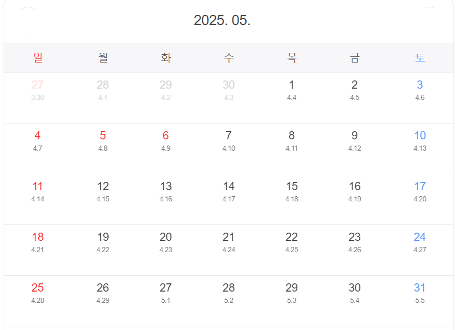 따라서 2025년 5월은 대부분 음력 4월에 해당하며, 양력 5월 27일부터 음력 4월 임오(壬午)월로 전환됩니다.