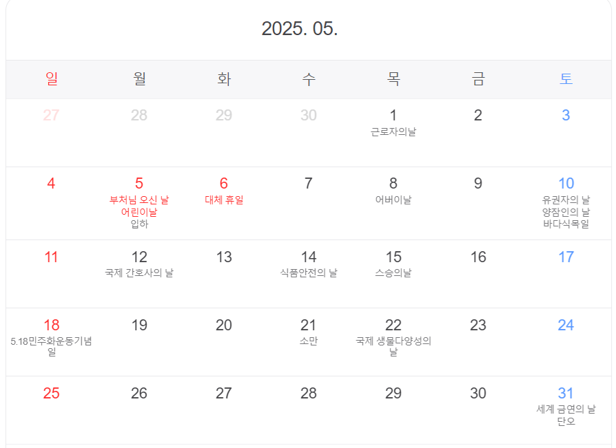 따라서 2025년 5월의 공휴일은 어린이날과 그 다음 날인 5월 6일의 대체공휴일로 구성되어 있습니다. 이 시기는 가족과 함께 소중한 시간을 보내며, 어린이의 권리와 행복을 생각하는 의미 있는 날이 됩니다.