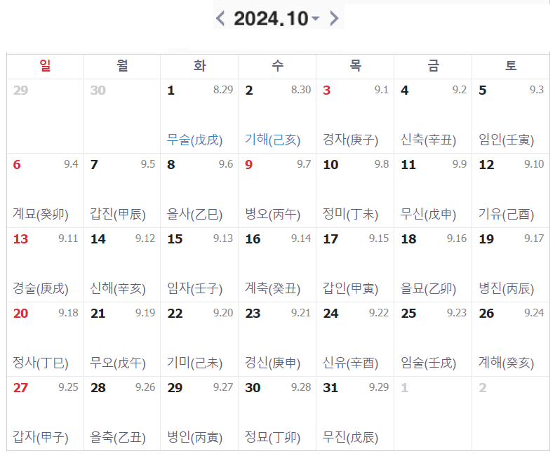 2024년 10월의 음력 날짜