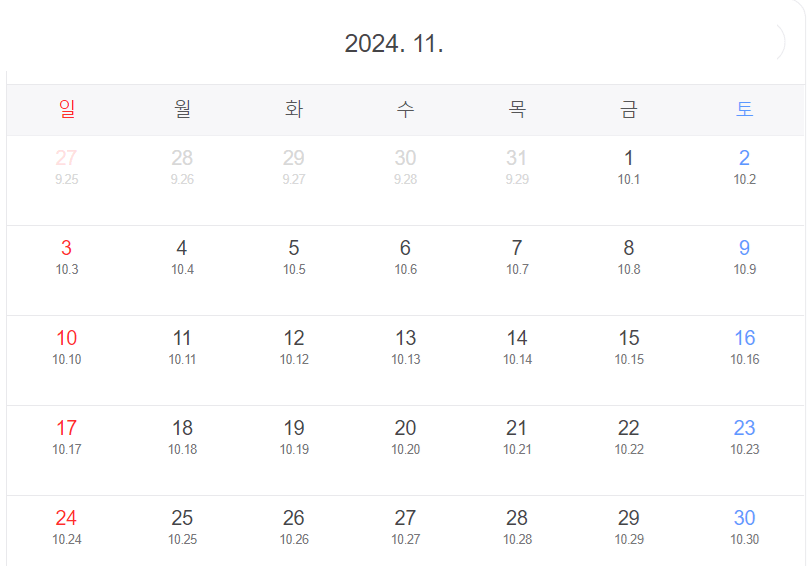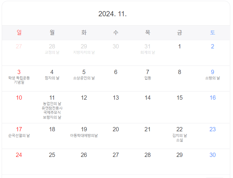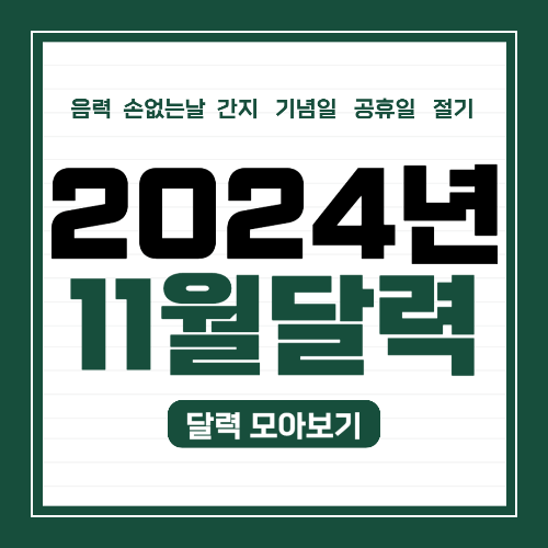 2024년 11월은 가을에서 겨울로 넘어가는 시기로, 계절의 변화를 느끼며 생활 리듬을 조정할 필요가 있습니다. 공휴일은 없지만 다양한 행사와 절기가 있어 풍성한 한 달이 될 것입니다.