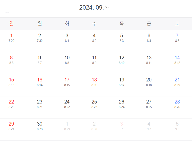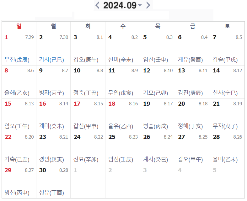 2024년 9월은 음력으로는 8월과 9월이 혼재된 시기입니다. 음력 8월은 여전히 더위가 남아 있지만, 9월로 넘어가면서 서서히 가을의 기운이 짙어지기 시작합니다. 음력 8월 15일에 해당하는 추석(9월 17일)은 9월의 가장 중요한 명절로, 많은 가정이 이 날을 중심으로 준비를 합니다. 이 외에도 음력으로 중요하게 여겨지는 날들이 9월에는 많아, 이를 확인하여 제사나 명절을 준비하는 것이 필요합니다.