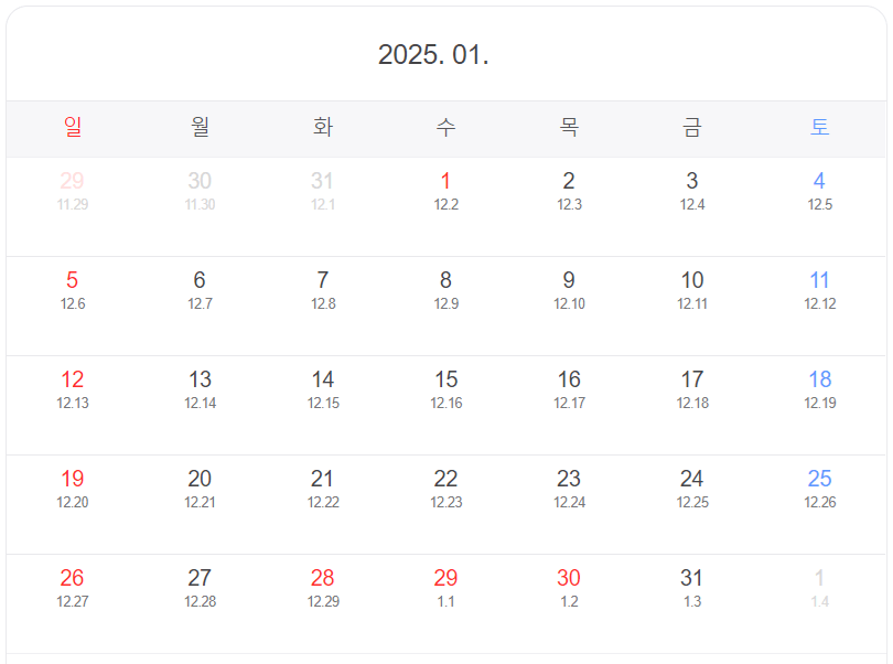 2025년 1월의 음력 날짜는 2024년 12월 2일부터 시작하여 2025년 12월 29일까지 이어집니다.  특히 1월 19일은 음력 12월 20일로, 많은 사람들이 세배나 차례를 지내는 날입니다. 음력의 변동에 따라 명절이나 기념일의 일정이 달라지므로, 음력 날짜를 기준으로 명절이나 중요한 일을 계획하는 데 도움이 됩니다. 음력 날짜를 잘 확인하는 것이 중요합니다. (음력은 태양의 움직임을 기준으로 하는 양력과 달리 달의 주기를 기준으로 합니다)
