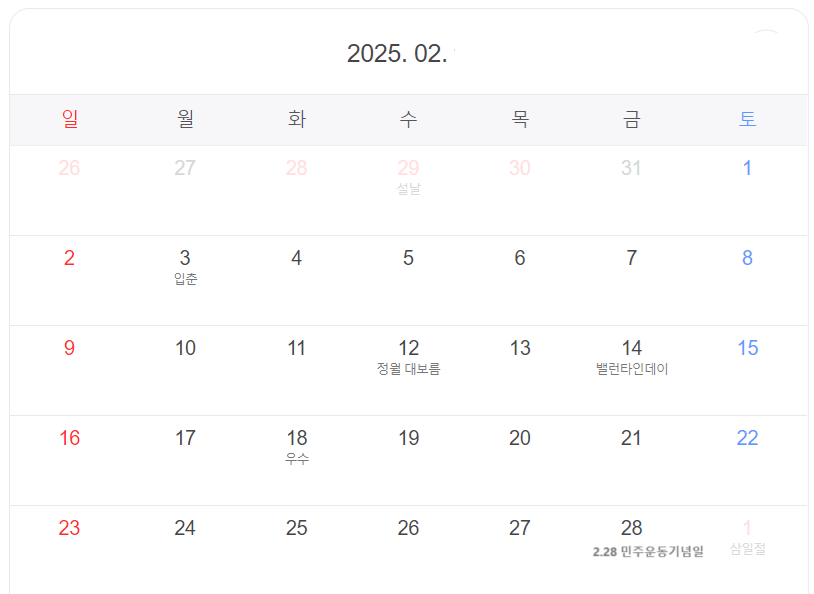 2025년 2월은 겨울의 끝자락과 봄의 시작을 맞이하며, 새로운 변화를 준비하는 중요한 시점입니다. 2월 달력 정보를 바탕으로 2월을 알차게 준비하고, 다가오는 봄을 맞이하는 준비를 철저히 하시길 바랍니다.